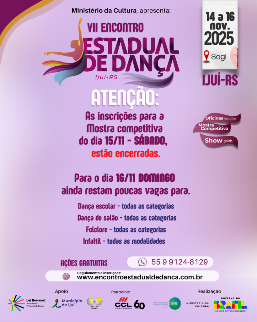 Encontro de dança com oficinas, mostra competitiva e espetáculos em diversas modalidades, aberto a participantes do Rio Grande do Sul, de outros estados brasileiros e de países estrangeiros.